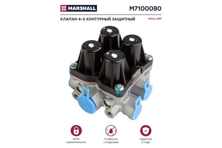 Клапан пневматической системы от MARSHALL с артикулом M7100080 для грузовой техники DAF и VOLVO. Надежная деталь, которая поможет поддерживать систему в рабочем состоянии.